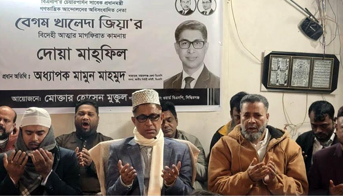 সিদ্ধিরগঞ্জের কদমতলী এলাকায় ২নং ওয়ার্ড বিএনপির সাধারণ সম্পাদক মোক্তার হোসেন মুক্তুলের আয়োজনে বেগম খালেদা জিয়ার রুহের মাগফেরাত কামনায় এই মিলাদ ও দোয়া মাহফিলের আয়োজন করা হয়।