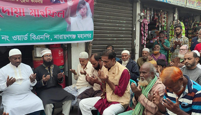 নিউজ ভিউ, নারায়ণগঞ্জ: বিএনপির চেয়ারপার্সন ও সাবেক প্রধানমন্ত্রী বেগম খালেদা জিয়ার রোগমুক্তি ও দীর্ঘ নেক হায়াত কামনা করে নারায়ণগঞ্জ সিটি কর্পোরেশনের ২৪ নং ওয়ার্ডে এক বিশেষ দোয়া মাহফিলের আয়োজন করা হয়। স্থানীয় নেতাকর্মী ও এলাকাবাসীর উদ্যোগে এই মোনাজাত অনুষ্ঠিত হয়।