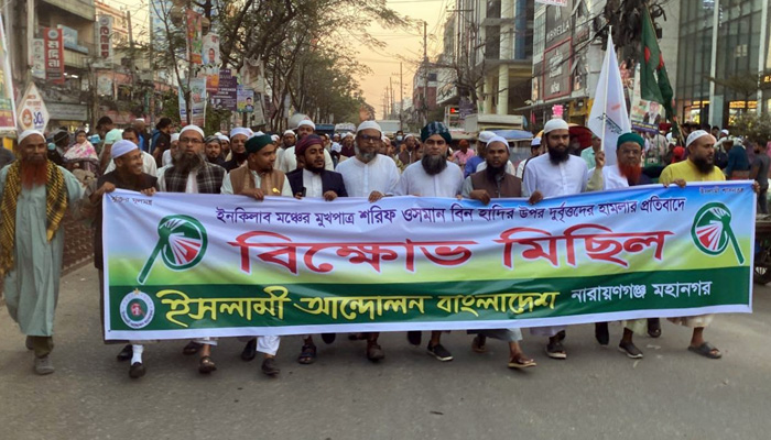 শনিবার (১৩ ডিসেম্বর) বাদ আসর ডিআইটি চত্বরে ইনকিলাব মঞ্চের মুখপাত্র শরিফ ওসমান বিন হাদির উপর দুর্বৃত্তদের হামলার প্রতিবাদে ইসলামী আন্দোলন বাংলাদেশ নারায়ণগঞ্জ মহানগর আয়োজিত বিক্ষোভ মিছিলে সভাপতির বক্তব্যে তিনি এসব কথা বলেন।