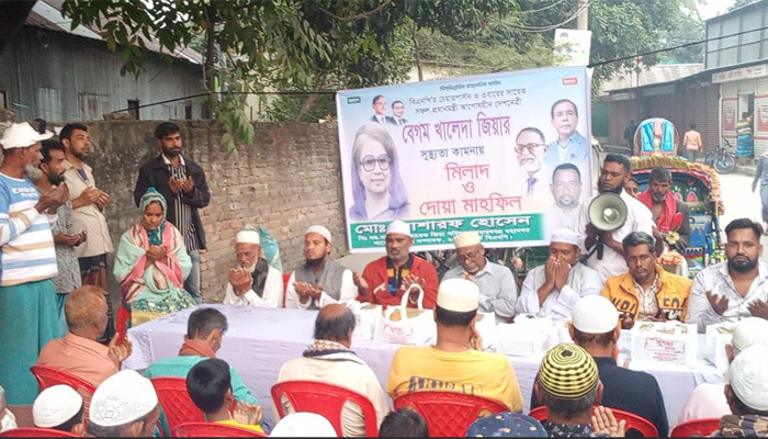 নিউজ ভিউ, নারায়ণগঞ্জ: বিএনপির চেয়ারপার্সন, সাবেক প্রধানমন্ত্রী দেশনেত্রী বেগম খালেদা জিয়ার আশু রোগমুক্তি ও সুস্থতা কামনায় বন্দর থানাধীন উত্তর লক্ষ্মণখোলা বাজার সংলগ্নে বিশেষ দোয়া মাহফিল অনুষ্ঠিত হয়েছে।