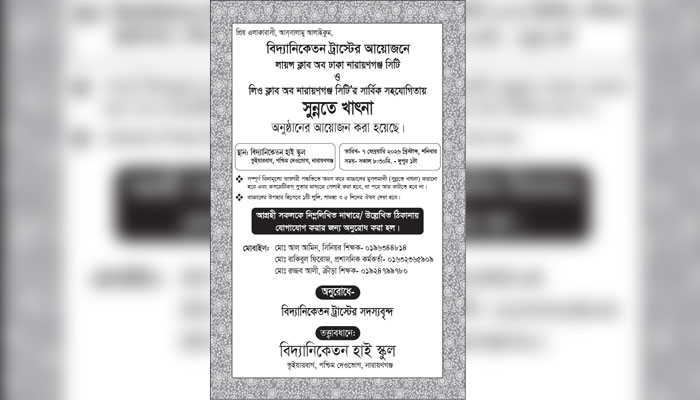 সামাজিক দায়বদ্ধতা আর সেবার ব্রত নিয়ে নারায়ণগঞ্জের পশ্চিম দেওভোগ এলাকায় আয়োজিত হতে যাচ্ছে এক ব্যতিক্রমী মানবিক অনুষ্ঠান। শিশুদের নিরাপদ স্বাস্থ্যসেবা নিশ্চিত করতে সম্পূর্ণ বিনামূল্যে অত্যাধুনিক পদ্ধতিতে ‘সুন্নতে খাৎনা’ কার্যক্রমের উদ্যোগ নিয়েছে বিদ্যানিকেতন ট্রাস্ট।