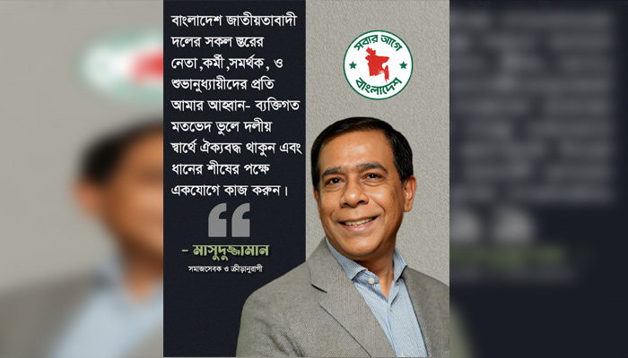 বিবৃতিতে মাসুদুজ্জামান মাসুদ বলেন, “বাংলাদেশ জাতীয়তাবাদী দলের সকল স্তরের নেতাকর্মী, সমর্থক ও শুভানুধ্যায়ীদের প্রতি আমার বিশেষ অনুরোধ—ব্যক্তিগত মতভেদ ভুলে দলীয় স্বার্থে ঐক্যবদ্ধ থাকুন। গণতন্ত্র পুনরুদ্ধারের এই লড়াইয়ে ধানের শীষের জয় নিশ্চিত করতে আমাদের একযোগে কাজ করতে হবে।”