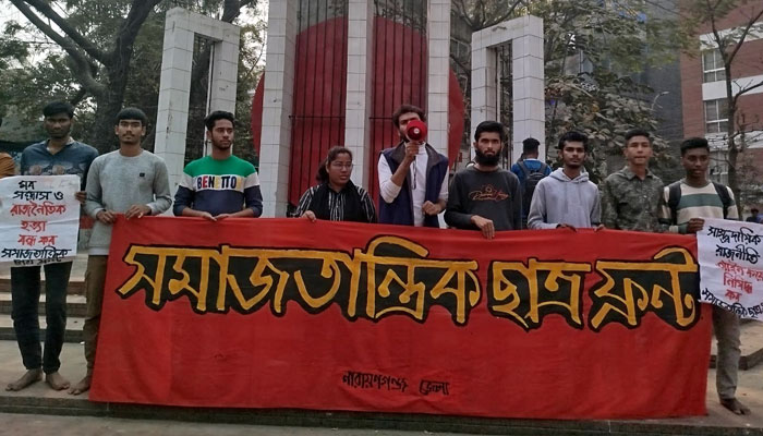 দীপু চন্দ্র দাস, ওসমান হাদি ও আয়েশাসহ সকল রাজনৈতিক হত্যাকাণ্ড, মব জাস্টিসের নামে সন্ত্রাস এবং অগ্নিসংযোগের বিচারের দাবিতে নারায়ণগঞ্জে বিক্ষোভ সমাবেশ অনুষ্ঠিত হয়েছে। সোমবার (১৯ জানুয়ারি) সকাল ১১টায় নারায়ণগঞ্জ কেন্দ্রীয় শহিদ মিনারের সামনে সমাজতান্ত্রিক ছাত্র ফ্রন্ট নারায়ণগঞ্জ জেলা শাখার উদ্যোগে এই সমাবেশ অনুষ্ঠিত হয়।