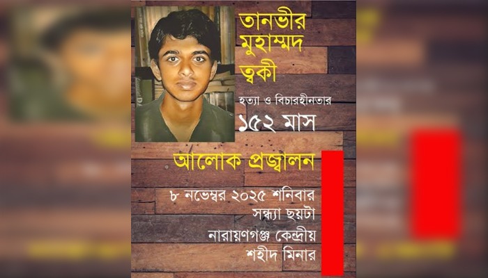 ত্বকীসহ সকল হত্যাকাণ্ডের দ্রুত বিচার এবং দেশে বিদ্যমান বৈষম্যমূলক বিচার ব্যবস্থার অবসানের দাবিতে নারায়ণগঞ্জ সাংস্কৃতিক জোট একটি আলোক প্রজ্জ্বলন কর্মসূচি ঘোষণা করেছে। এই কর্মসূচিটি আগামী ৮ নভেম্বর, শনিবার সন্ধ্যা ছয়টায় নারায়ণগঞ্জ কেন্দ্রীয় শহীদ মিনারে অনুষ্ঠিত হবে। নারায়ণগঞ্জ সাংস্কৃতিক জোটের উদ্যোগে আয়োজিত এই কর্মসূচিতে সকল শ্রেণী-পেশার মানুষের অংশগ্রহণের আহ্বান জানানো হয়েছে।