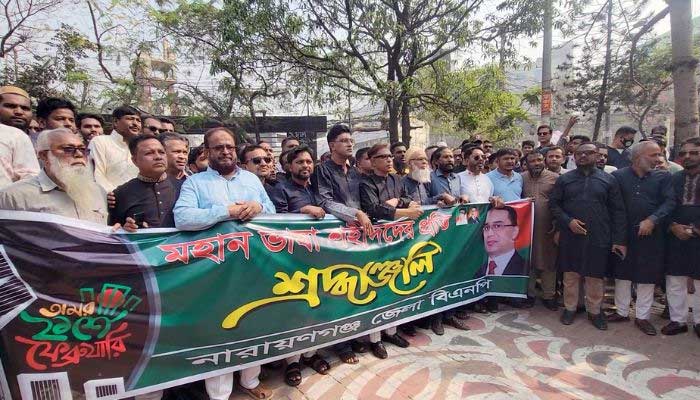 সকাল থেকেই জেলা বিএনপির বিভিন্ন ইউনিটের নেতাকর্মীরা খণ্ড খণ্ড মিছিল নিয়ে চাষাড়া প্রাঙ্গণে জড়ো হন। পরে জেলা বিএনপির আহ্বায়ক অধ্যাপক মামুন মাহমুদের নেতৃত্বে মূল বেদিতে পুষ্পস্তবক অর্পণ করা হয়। শ্রদ্ধা নিবেদন শেষে সমবেত নেতাকর্মীরা কিছুক্ষণ নীরবতা পালন করেন এবং ভাষা শহীদদের রুহের মাগফিরাত কামনায় বিশেষ দোয়া ও মোনাজাত করেন।